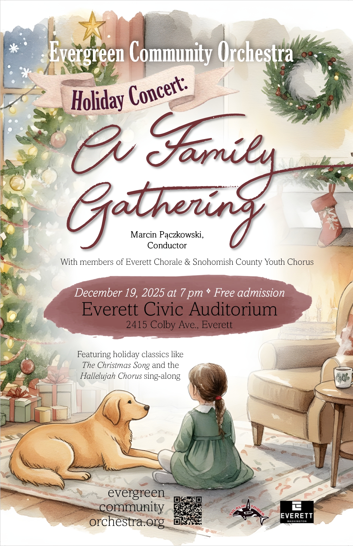 Everett Civic Auditorium 2415 Colby Ave, Everett, WA, United StatesWe are excited to announce that the Evergreen Community Orchestra will be performing a holiday concert, titled “A Family Gathering”. The orchestra will perform some holiday favorites, including “A Charlie Brown Christmas”, as well as the electrifying “Christmas Eve/Sarajevo”. Members of both the Everett Chorale, and the Snohomish County Youth Chorus, will join the orchestra […]